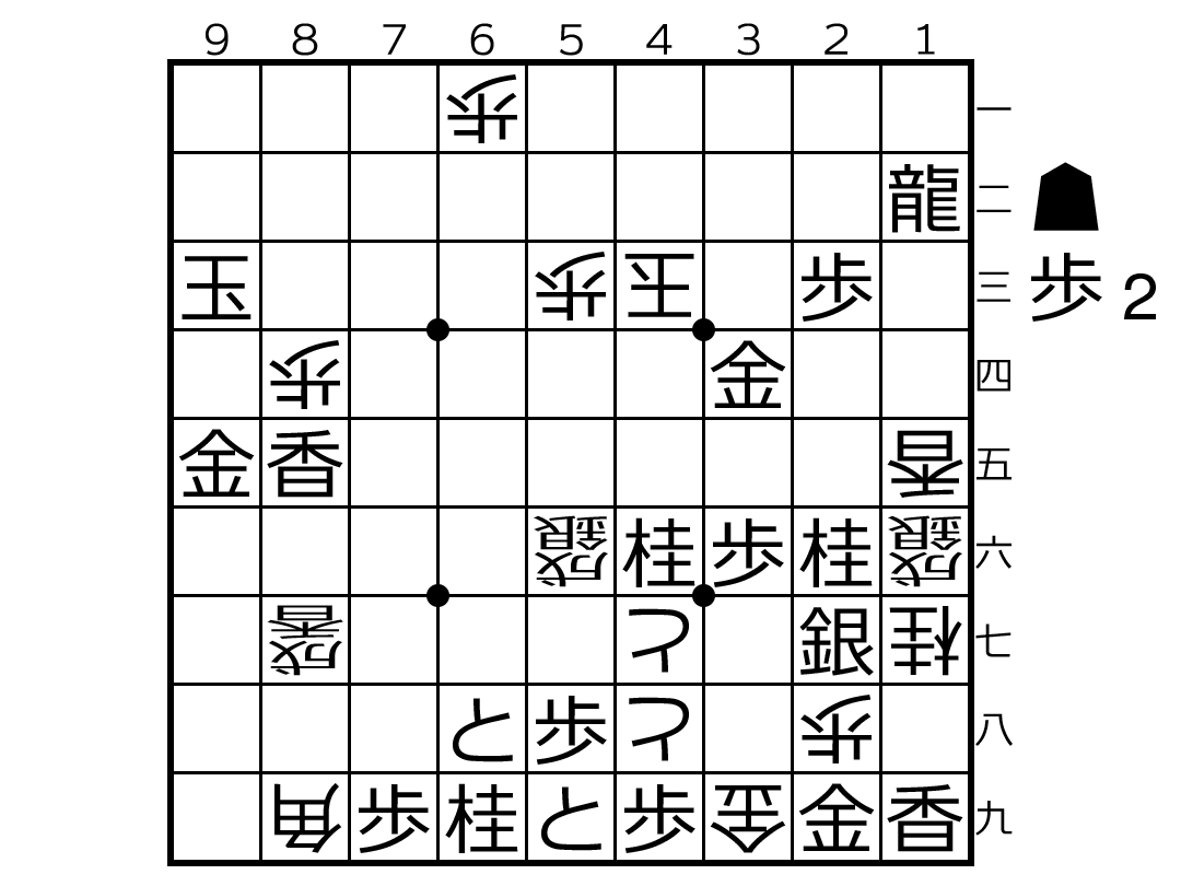ここで今まで通りなら24玉だが、作意は44玉と変化して収束に入る。収束に入るタイミングは受方に委ねられているのだ。受方は54歩、35歩、25歩の有無を都合よく選ぶことができ、逆にいうと収束は、これらの歩があってもなくてもいずれも詰むようになっていなければ作品が成立しない。実際に手順を並べてみると分かるが、収束で龍は54と35を通過するので、そこに受方の歩があってもなくても取られるだけであり、また玉も25を通るので、やはり攻方の25歩があってもなくてもいいようにできている。